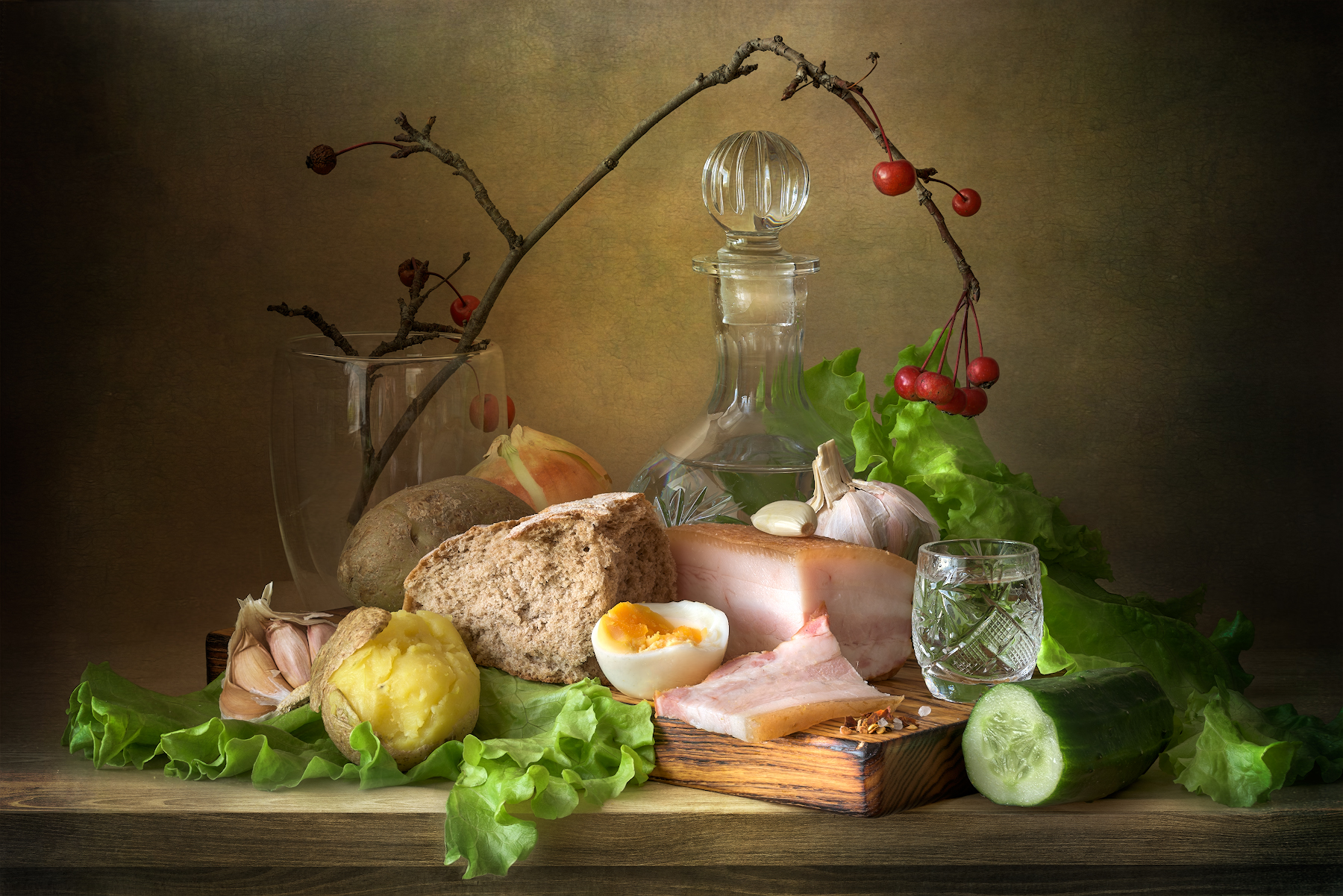 По-правде сказать, во время съёмки пищевые рефлексы как-то сами собой отключаются, а вот потом, конечно, всё бодро сметается. Ну, тут ещё и ингредиенты в диетологическом плане не сильно сочетаемы (типа, огурец и молоко), но основатели жанра — голандцы — тоже частенько валили всё в одну кучу: битая неощипанная птица, дохлая рыба, фрукты, булки, кожура и мусор, гигнантские улитки (ахатины) и т. п. запросто могли соседствовать в одной раскладке (видать, по принципу "шоб густо и богато"). В любом случае, возиться с такими композициями довольно интересно — предметы меняют своё взаимодействие друг с другом при малейшем изменении положения, общая геометрия, мелкие детали, световой рисунок задают настроение, атмосферу. Она, собственно, и важна. А конкретно этот сюжет снимался при свете от окна в пасмурную погоду и, потому, недолго, без длинной расстановки осветительных приборов. Пара оттенителей, фон — вот и весь потребный скарб. Аппарат полноформатный, объектив 105 мм.