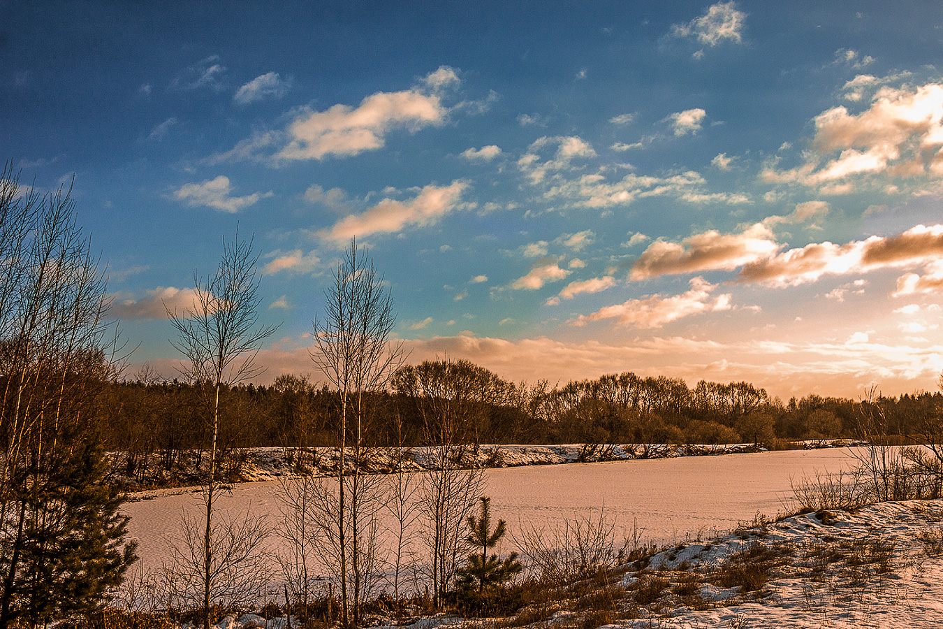 Наташ, мне кажется, цвета перекручены: деревья и снег на речке стали какого-то странного цвета, облака - желто-коричневые. На ПП, действительно, много лишнего, надо попробовать ближе к реке подойти.